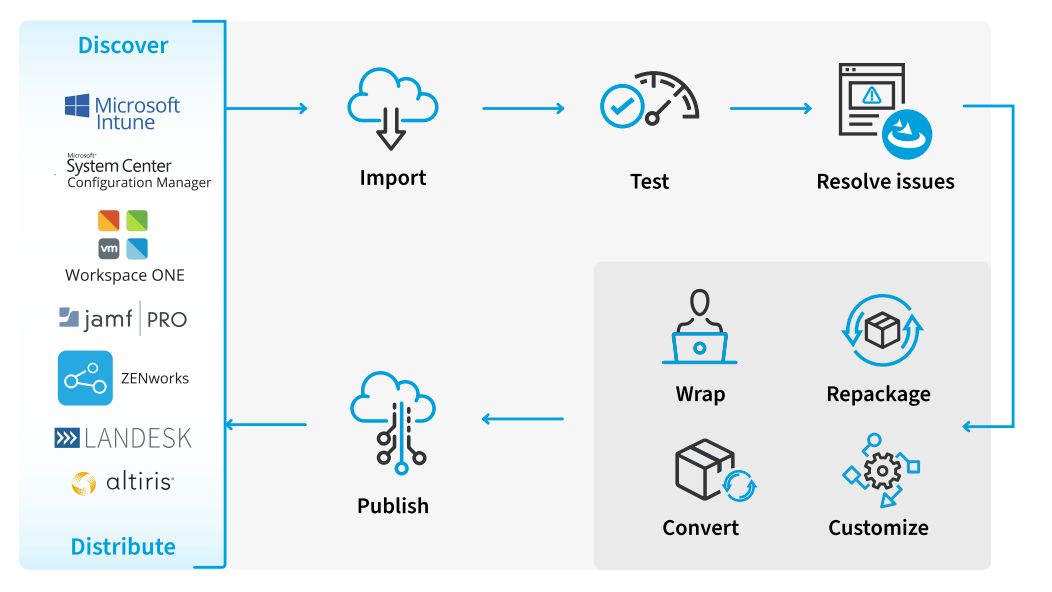 AdminStudio also integrates with enterprise management systems like SCCM, Intune, and Workspace ONE and automates much of the application lifecycle management process.