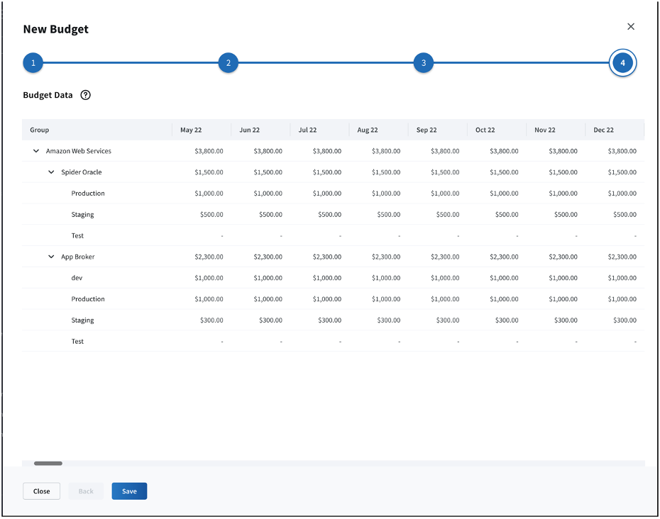With Cloud Budgets, you can manage multiple of these cloud budgets defined by business rules, with proactive alerting when a budget begins to reach a user-defined threshold or actual spend. Cloud Budgets enables cloud and FinOps teams to understand performance vs. budget, proactively manage changes in spend and understand and contextualize spikes in spend.