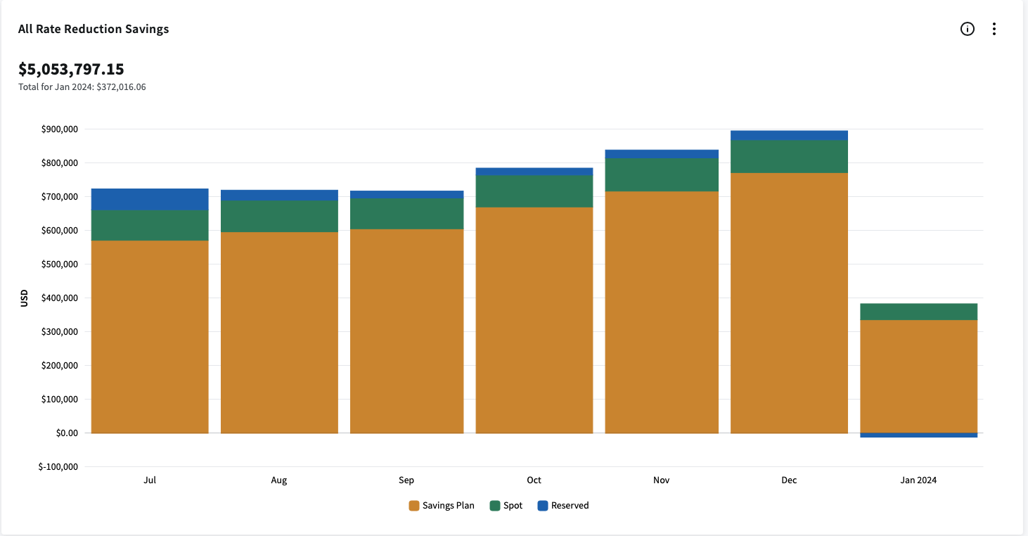 - Savings: amount saved from Reserved Instance, Savings Plan, and Spot discounts
