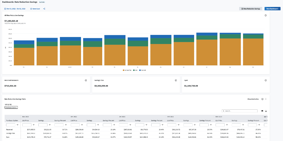 A new AWS Realized Savings dashboard in Q3 of 2023 gives an easily digestible summary of the realized savings of rate optimization efforts in AWS. This allows you to easily demonstrate the direct value of your FinOps efforts to leadership and relevant stakeholders. It also includes the addition of new cost metrics, such as: