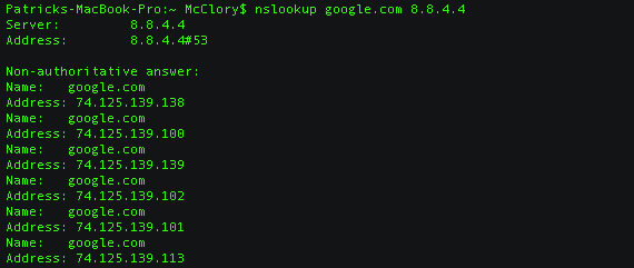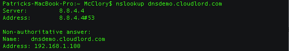 I’m working from a Mac and the process is a little different for Windows-based machines, so check out more on nslookup for *nix and Windows. I’m also using one of Google’s public DNS servers to perform my lookups. Check out the request below and note that when I query DNS, I’m getting a single address back for my test domain of dnsdemo.cloudlord.com: