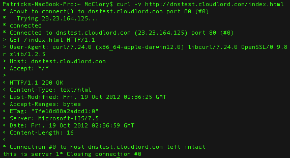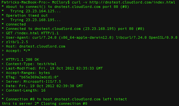 Figure 4 below shows DNS load balancing in action using dnstest.cloudlord.com and a test file that indicates which server is being served up. For this example, I set up my dnstest.cloudlord.com domain with two A records. Note that this first request has one attempt and the content reads that “this is server 1.”