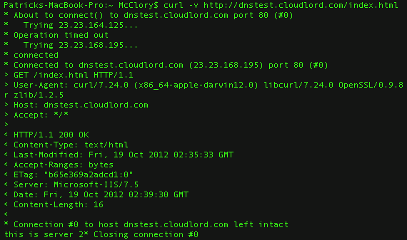 Figure 5 – Curl request to test domain with primary A record in failed state (note timeout and new IP)