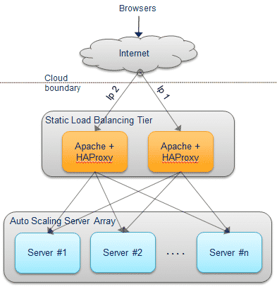 Figure 8 – Full incoming connection diagram showing multiple load balancers with their own IP addressThis is a great way to protect against failure and increase overall throughput, giving you the ability to scale for high availability and high performance.