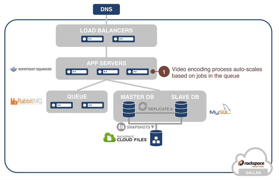 The architecture shown below is for a mobile application that allows users to upload video. A batch process is needed to encode the video and serve it in different formats. It includes an auto-scaling Sorenson Squeeze array that performs the video encoding. This array scales based on the length of the job queue. A MySQL database maintains video meta-data.