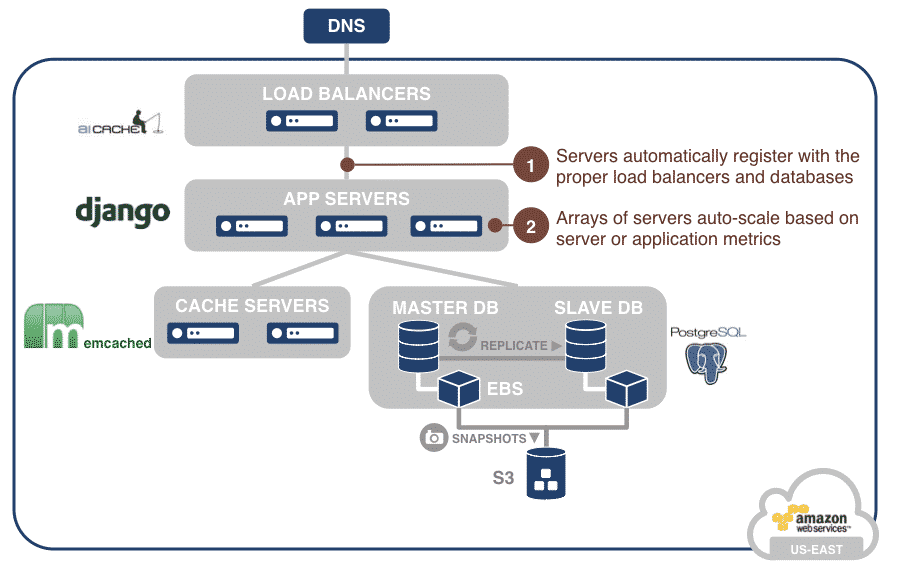 With RightScale monitoring and alerting, the Django application tier auto-scales up and down. Application activity is monitored – for example, the level of CPU use and the number of incoming requests – and the optimal number of application server is always maintained. RightScripts or Chef recipes connect the application servers to the proper load balancers and databases automatically in real time.