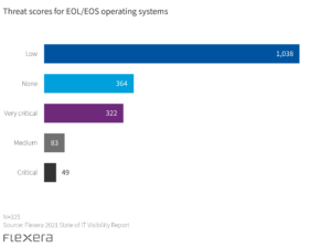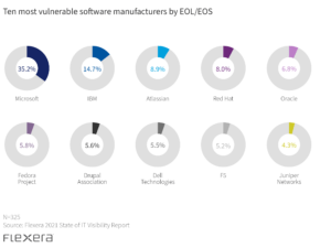 For example, the Flexera State of IT Visibility Report found that Micro Focus and VMware were among the top five vendors for most EOL/EOS software assets in 2021—but neither make the top ten when connecting unique vulnerabilities to EOL/EOS. These unique vulnerabilities are those associated with a minor version software release. What’s the useful insight? Not all IT assets reaching EOL/EOS are created equal—and each manufacturer presents varying degrees of vulnerability that shouldn’t be assumed by the volume of products reaching EOL/EOS.
