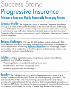 Progressive uses AdminStudio to capture package installs, create transforms, edit MSIs, and remediate compatibility issues. “AdminStudio provides our application packagers everything they need to deliver quality applications, AdminStudio is more than just a “packaging tool”, it’s a complete solution capable of handling the challenges of managing our 1,700 packaged software titles.” “Additionally, we leverage the virtualization readiness tests in AdminStudio to help identify the best candidates for application virtualization. Upon completion of our Configuration Manager 2012 migration we expect to deploy more App-V packages with more frequency” reports Steve Costell a lead Systems Engineer in the End User Computing group, “Progressive is now more flexible with their resources, can measure each request and track the status of each packaging job. They also store all documentation and team knowledge around the packaging process in a single place that enables Progressive to balance workloads between team members, and allows new resources to pick up the job and know exactly where the packaging job is in the process and what needs to happen next. Once the software package is completed, tested, and approved, the final step in the process is to launch the workflow that notifies the System Administrator that the package is ready for deployment to Microsoft System Center Configuration Manager. Visibility into the major steps in the packaging processes is now enabling Progressive to continually improve their processes.