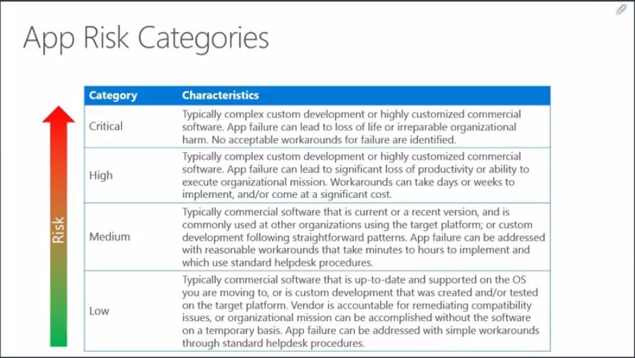 Understanding the risk of the applications in your portfolio is the first step. “If you ask most business owners to identify the criticality of the software they are using, we have found that the most typical result is to discover that 85% of all software is defined as business critical.” That is really high, especially for enterprises with thousands of applications. Most organization have at least 20% that are high and critical apps. These are often complex custom developed or heavily customized commercial products. In the highest risk categories, failure can lead to severe harm to the business, significant loss of productivity or ability to execute on the business mission. Workarounds can take days or weeks to implement, and come at a significant cost.