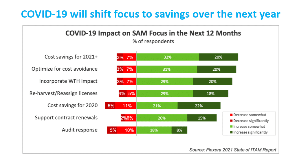 As the impact of the COVID-19 pandemic materializes, organizations are doubling down to reduce their cost structure and create efficiency across their entire spend. With many of those savings expected to be delivered by SAM teams, organizations are increasing their focus on SAM best practices. While 15 percent say they will have a decreased focus on audit response, this will be worth watching as some analysts are predicting that software vendors may increase audits in 2021 to help reduce negative revenue impacts of the pandemic and recession.