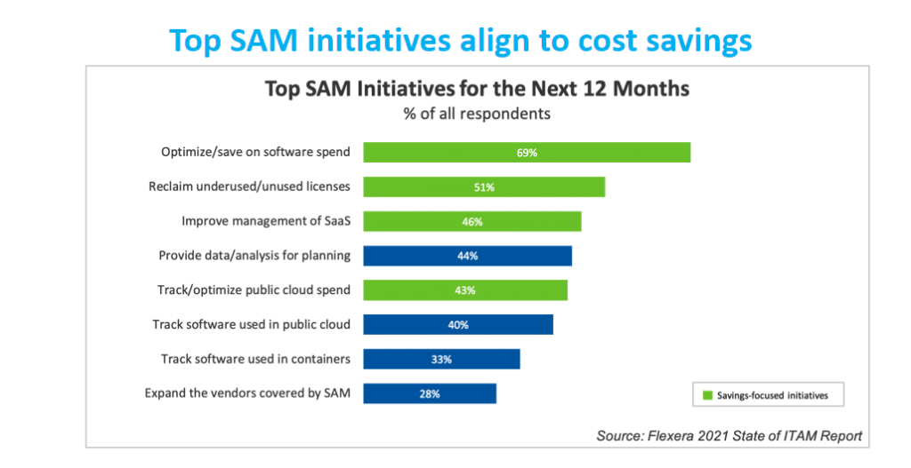 Often, the top SAM initiatives will align with cost savings. In the next 12 months, 69 percent of the organizations plan to focus on optimizing and saving on software spend.