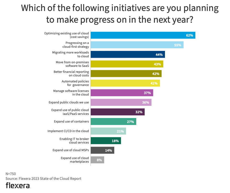 It’s therefore not surprising that optimizing existing use of the cloud (cost savings) once again remains the top initiative for organizations, followed by migrating more workloads to the cloud. As organizations continue to embrace the cloud, they can retire the technical debt associated with maintaining and operating traditional data centers. Moving to SaaS solutions eliminates the resources required to manage equivalent on-premises software packages.