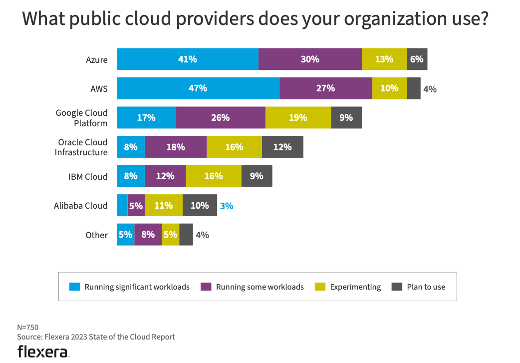Last year was the first year Azure surpassed AWS in adoption rates, but the 2023 report indicates AWS is back on top, with 47 percent using the provider in significant workloads and 41 percent using Azure. Oracle, IBM and Alibaba cloud services remained relatively unchanged.