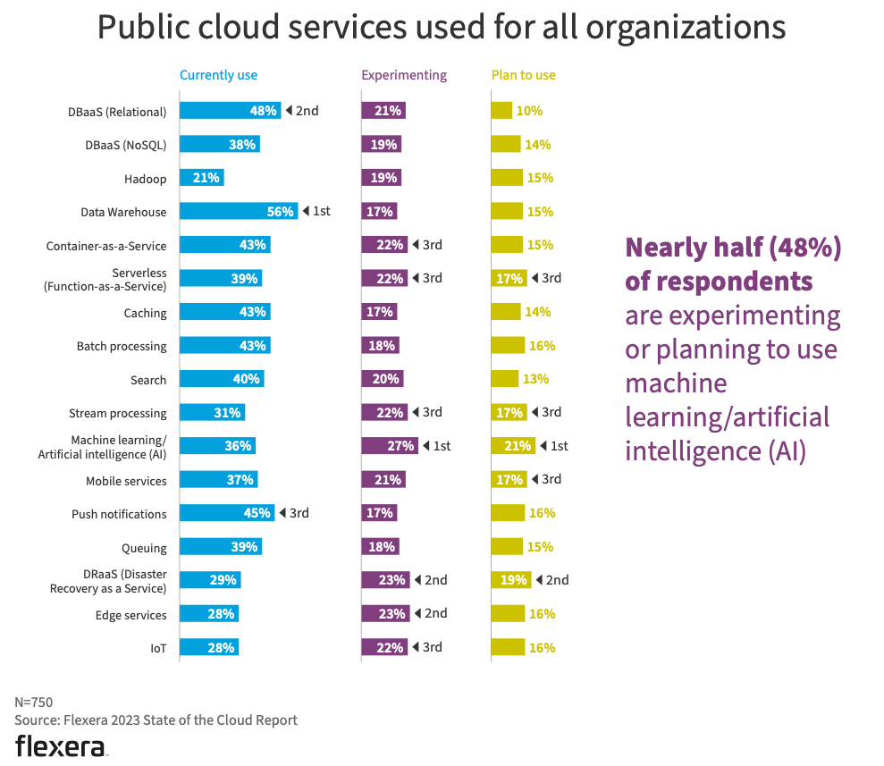 Similar to last year, data warehouse is the most commonly used PaaS offering, followed by DBaaS (relational). Machine learning/artificial intelligence is being experimented with more than any other service; not surprisingly, it’s also the leading PaaS offering that organizations plan to use.