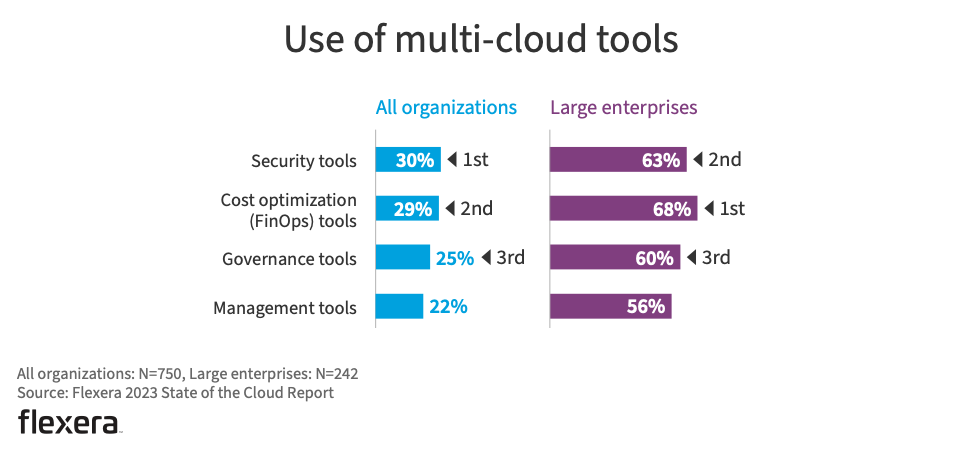 Across the board for all organizations, security tools continue to lead, followed closely by tools for cost optimization (FinOps). However, large enterprises reverse the order, with 68 percent using FinOps tools and 63 percent using security tools.