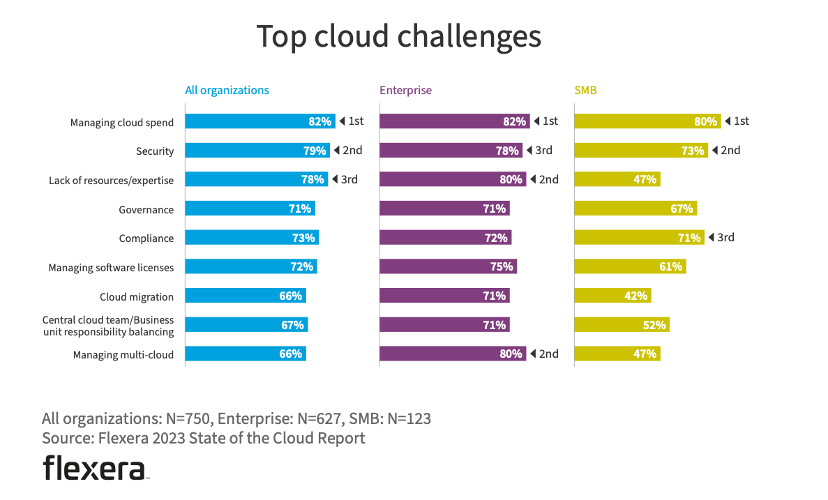 Given the current global economic volatility, 2023 marks the first time that managing cloud spend has overtaken security as the top challenge facing all organizations. This trend indicates it’s more critical than ever to get a handle on forecasting and cost optimization through FinOps practices. As we’ve seen in previous years, a lack of resources/expertise also continues to be a significant challenge.